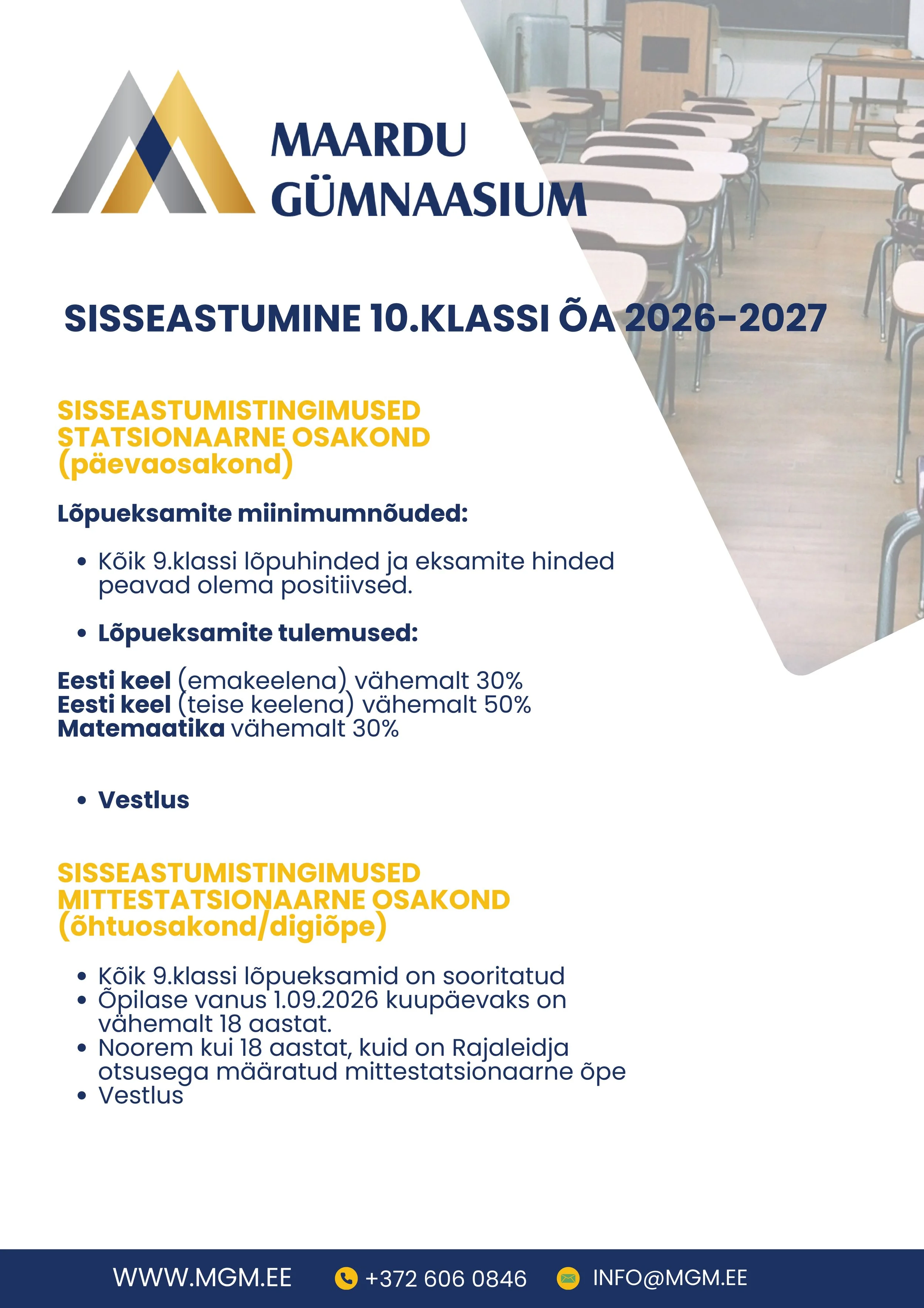 10. klassi sisseastumiseks vajuta siia. 10. klassi sisseastumiseks vajuta siia. 1. klassi registreerumiseks vajuta siia. 1. klassi registreerumiseks vajuta siia. Teistesse klassidesse sisseastumiseks palun pöördu dokumentide alla. Teistesse klassidesse sisseastumiseks palun pöördu dokumentide alla.